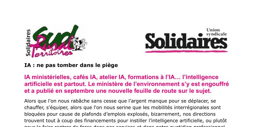 Alors que l'on nous rabâche sans cesse que l’argent manque pour se déplacer, se chauffer, s’équiper, alors que l'on nous serine que les mobilités interrégionales sont bloquées pour cause de plafonds d’emplois explosés, bizarrement, nos directions trouvent tout à coup des financements pour instiller l’intelligence artificielle, ou plutôt pour la faire rentrer de force dans nos services et dans notre quotidien professionnel.