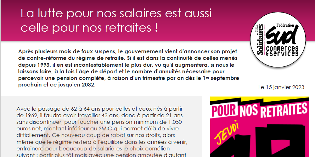 Pour gagner le retrait de leur "réforme", rejetée par 93 % des actifs selon un récent sondage, il est nécessaire d'inscrire la lutte dans le temps et de s'adresser, outre à nos collègues, aux autres syndicats dans nos entreprises, quand ils existent, ainsi que se coordonner au niveau local et dans nos secteurs d'activités, alors que le projet de loi sera soumis au Parlement dès le mois prochain.