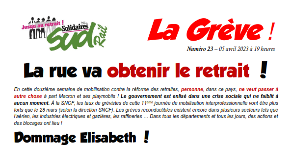 En cette douzième semaine de mobilisation contre la réforme des retraites, personne, dans ce pays, ne veut passer à autre chose à part Macron et ses playmobils ! Le gouvernement est enlisé dans une crise sociale qui ne faiblit à aucun moment. À la SNCF, les taux de grévistes de cette 11ème journée de mobilisation interprofessionnelle vont être plus forts que le 28 mars (selon la direction SNCF). Les grèves reconductibles existent encore dans plusieurs secteurs tels que l’aérien, les industries électriques et gazières, les raffineries … Dans tous les départements et tous les jours, des actions et des blocages ont lieu !