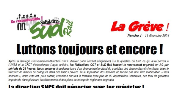 Après la stratégie Gouvernement/Direction SNCF d’isoler notre combat uniquement sur la question du Fret, ce qui aura permis à l’UNSA et la CFDT d’abandonner l’appel unitaire, les fédérations CGT et SUD-Rail lancent le mouvement organisé en AG par période de 24 heures. Nous sommes à quelques jours d’un changement profond du quotidien des cheminotes et cheminots, avec le transfert de milliers de collègues dans des filiales privées. Si la séparation des activités ne facilite pas une forte mobilisation « tous services », notre lutte est, pour autant, enracinée sur tout le territoire avec plus de 90 Assemblées Générales, des taux de grévistes importants dans plusieurs établissements et des plans de transports régionaux dégradés.