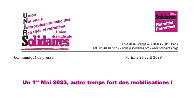 L’Union Nationale Interprofessionnelle des Retraitées et Retraités Solidaires (UNIRS) appelle à participer à toutes les manifestations qui se dérouleront dans le pays le 1er mai 2023. À Paris, la manifestation débutera à 14 heures de la Place de la République, pour aller vers la Place de la Nation, par deux itinéraires. L’un, avec en tête Solidaires, passera par l’Avenue de la République, le Père Lachaise, Ménilmontant ; l’autre, avec en tête l’UNSA, passera par le Boulevard Voltaire.