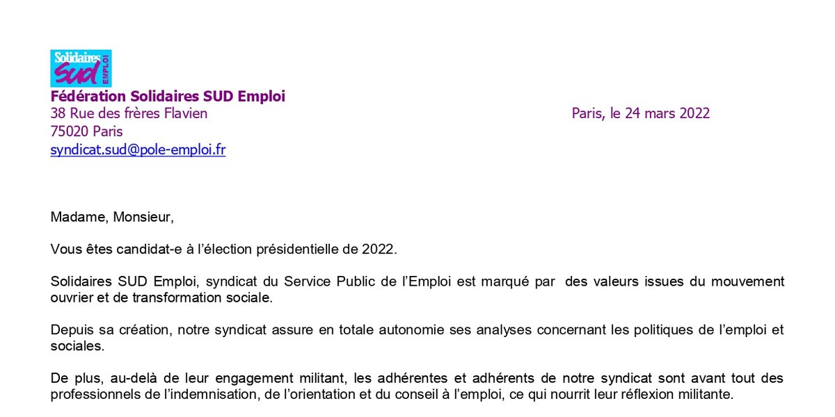 Dès lors, Solidaires SUD Emploi vous interpelle directement, pour que vous preniez des engagements sur les sujets qui font le quotidien de toutes et tous.