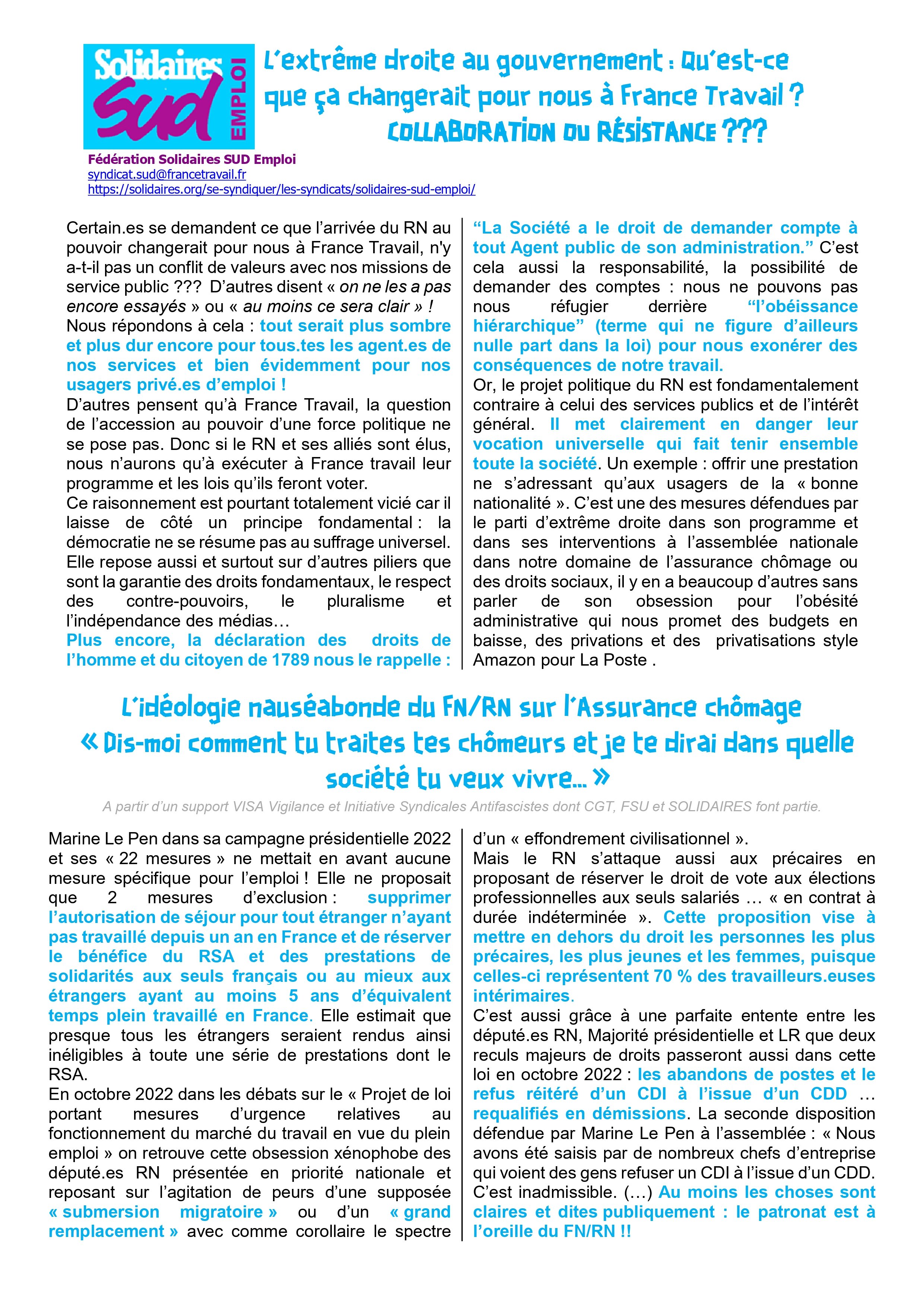 des mesures défendues par le parti d’extrême droite dans son programme et dans ses interventions à l’assemblée nationale dans notre domaine de l’assurance chômage ou des droits sociaux, il y en a beaucoup d’autres sans parler de son obsession pour l’obésité administrative qui nous promet des budgets en baisse, des privations et des privatisations style Amazon pour La Poste .