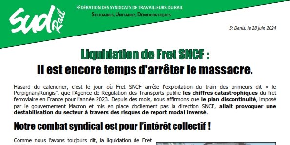 La fédération SUD-Rail le dit et agit avec détermination dans ce sens : il n'est pas trop tard ! Nous pouvons encore éviter le naufrage du fret ferroviaire public. Il ne faut pas liquider Fret SNCF d’ici le 31 décembre 2024 et entamer un bouleversement de la politique des transports. La SNCF est la seule entreprise ferroviaire qui a encore des capacités fédératrices et mutualisatrices au niveau des territoires pour relancer le fret ferroviaire.