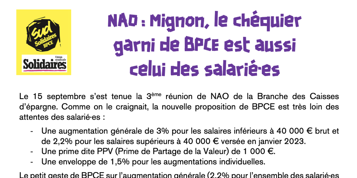 Le petit geste de BPCE sur l’augmentation générale (2,2% pour l’ensemble des salarié·es au départ) est encore un affront fait aux salarié·es au regard du taux d’inflation de l’ordre de 7% actuellement.