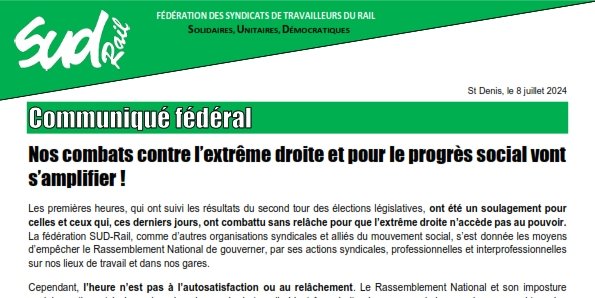 Les premières heures, qui ont suivi les résultats du second tour des élections législatives, ont été un soulagement pour celles et ceux qui, ces derniers jours, ont combattu sans relâche pour que l’extrême droite n’accède pas au pouvoir. La fédération SUD-Rail, comme d’autres organisations syndicales et alliés du mouvement social, s’est donnée les moyens d’empêcher le Rassemblement National de gouverner, par ses actions syndicales, professionnelles et interprofessionnelles sur nos lieux de travail et dans nos gares.