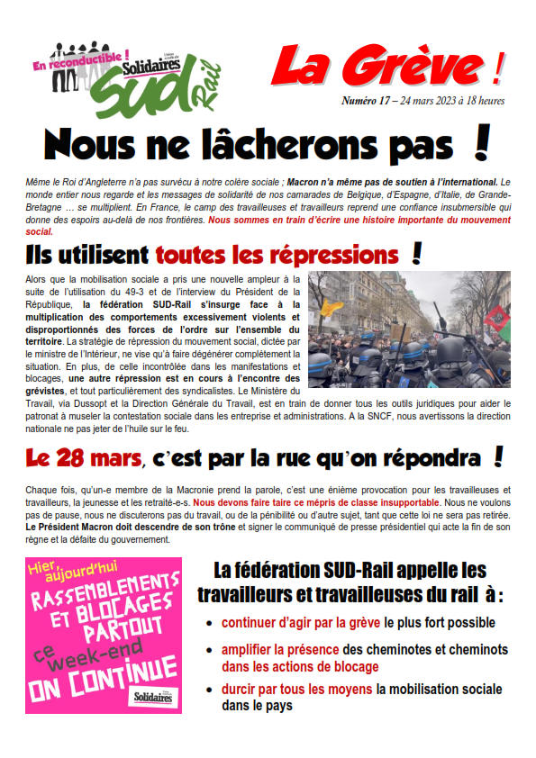 Même le Roi d’Angleterre n’a pas survécu à notre colère sociale ; Macron n’a même pas de soutien à l’international. Le monde entier nous regarde et les messages de solidarité de nos camarades de Belgique, d’Espagne, d’Italie, de Grande-Bretagne … se multiplient. En France, le camp des travailleuses et travailleurs reprend une confiance insubmersible qui donne des espoirs au-delà de nos frontières. Nous sommes en train d’écrire une histoire importante du mouvement social.