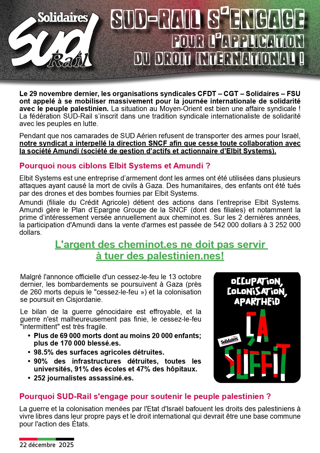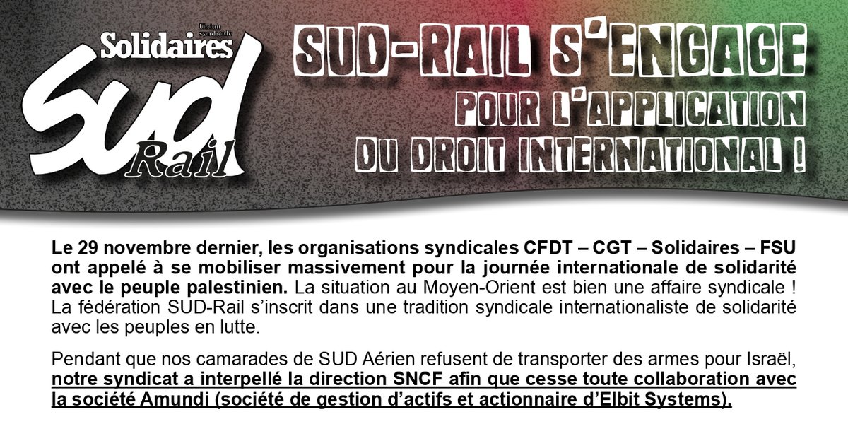 Pendant que nos camarades de SUD Aérien refusent de transporter des armes pour Israël, notre syndicat a interpellé la direction SNCF afin que cesse toute collaboration avec la société Amundi (société de gestion d’actifs et actionnaire d’Elbit Systems).