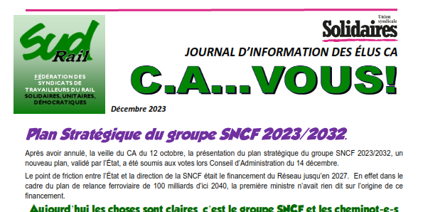 Après avoir annulé, la veille du Conseil d'Administration du 12 octobre, la présentation du plan stratégique du groupe SNCF 2023/2032, un nouveau plan, validé par l’État, a été soumis aux votes lors Conseil d’Administration du 14 décembre.
