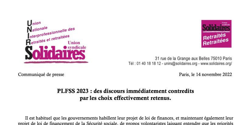 Les résultats de ces choix politiques, nous les voyons tous les jours : une minorité toujours de plus en plus riche, qui fait exploser le marché du luxe, celui du « marché de l’art » et celui des constructions de bateaux de plaisance pharaoniques, qui peut s’acheter des entreprises de plus en plus puissantes, qui pèse désormais plus que le PIB de nombre d’Etats et, pendant le même temps, des populations toujours plus nombreuses qui connaissent la misère, même dans les pays dits riches et développés. En cette fin novembre 2022, les militantes et les militants de l’UNIRS, avec celles et ceux des autres organisations de retraité·e·s, rencontrent les députés et les sénateurs et les mettent face à leurs responsabilités : il faut changer de priorités politiques et traduire ceci par d’autres lois de financement.