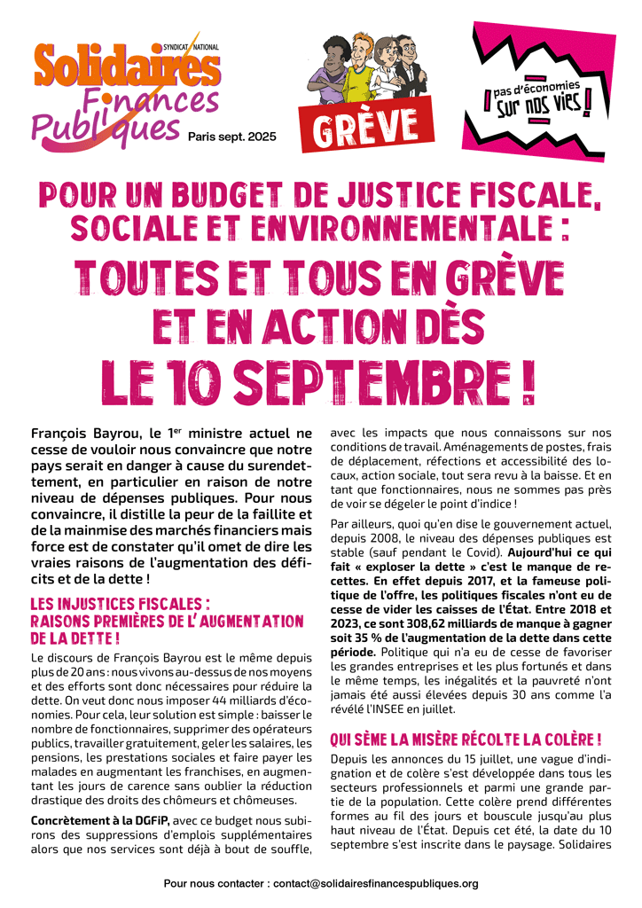 Depuis les annonces du 15 juillet, une vague d’indignation et de colère s’est développée dans tous les secteurs professionnels et parmi une grande partie de la population. Cette colère prend différentes formes au fil des jours et bouscule jusqu’au plus haut niveau de l’État. Depuis cet été, la date du 10 septembre s’est inscrite dans le paysage. Solidaires Finances Publiques appelle, dès ce jour là, à se mettre en grève et à participer à l’ensemble des actions qui auront lieu sur le territoire. C’est pour les agentes et agents des Finances Publiques l’occasion de rappeler que de l’argent, il y en a - et aux Finances, on le sait ! Le 10 est une première étape essentielle pour exprimer notre colère face aux politiques budgétaires qui appauvrissent le plus grand nombre et détruisent les services publics. Elle ne s’arrêtera pas là : d’ores et déjà, avec ou sans Bayrou, l’intersyndicale interprofessionnelle appelle à une nouvelle journée de grève le 18 septembre. En attendant, montrons dès le 10 septembre notre détermination à imposer nos revendications.