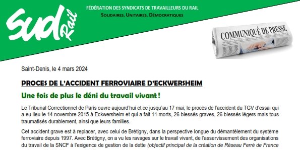 Le Tribunal Correctionnel de Paris ouvre aujourd’hui et ce jusqu’au 17 mai, le procès de l’accident du TGV d’essai qui a eu lieu le 14 novembre 2015 à Eckwersheim et qui a fait 11 morts, 26 blessés graves, 26 blessés légers mais tous traumatisés durablement, ainsi que leurs familles.