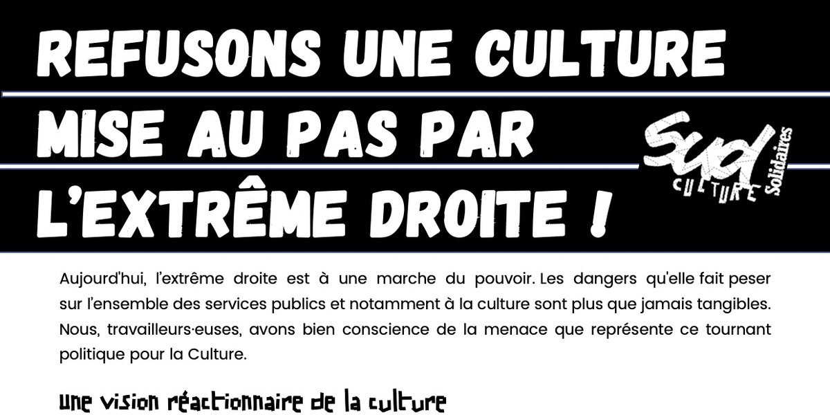 Aujourd'hui, l’extrême droite est à une marche du pouvoir. Les dangers qu'elle fait peser sur l’ensemble des services publics et notamment à la culture sont plus que jamais tangibles. Nous, travailleurs·euses, avons bien conscience de la menace que représente ce tournant politique pour la Culture.