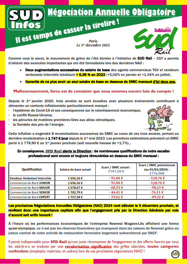 Il parait indispensable pour SUD Rail qu’une juste récompense de l’engagement et des efforts fournis par tous les salariés se traduise par une revalorisation significative des grilles salariales, toutes catégories confondues (employés, maitrises, et cadres) lors de ces prochaines négociations NAO !