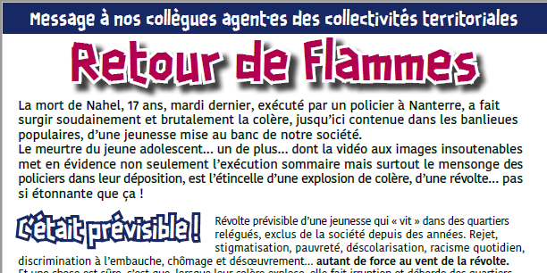 Difficile de rester zen face aux appels de certains élus locaux, maires, présidents de Départements, etc. qui, d’un côté font des choix politiques et budgétaires qui dépècent nos services et appellent, de l’autre, la population à des « rassemblements républicains » pour condamner les attaques de cette jeunesse contre les bâtiments publics.