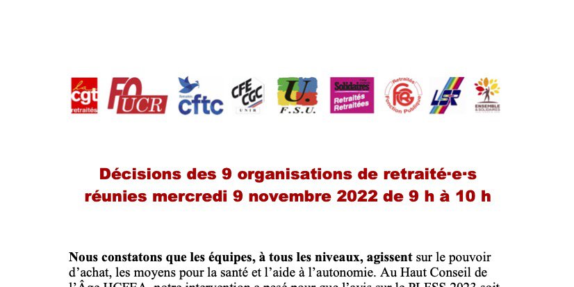 Le compte-rendu de la réunion imprévue des 9 organisations de retraité·e·s de mercredi 9 novembre figure sous deux formes :