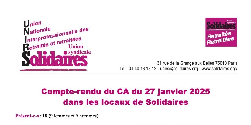 - Derniers préparatifs pour l’AG du lendemain, mardi 28 janvier 2025 : organisation matérielle (examen de la liste des inscriptions enregistrées pour les structures nationales et pour les UDIRS dans les départements + « cavaliers nominatifs » + accueil du matin + café et viennoiseries + enregistrement des entrées + remise d’un dossier + etc.) ; coupure de midi (apéritif et repas, en fin d’après-midi, il y aura des derniers achats à faire) ; gestion de la visio ; présidence de séance ; présentation du rapport d’activité et organisation des interventions ; organisation de la discussion sur la place de l’UNIRS dans Solidaires et sur notre droit de vote dans ses instances ; organisation de la discussion sur l’évolution de la cotisation de l’UNIRS pour les structures nationales et pour les structures départementales ; organisation des débats sur la trésorerie de l’UNIRS ; présentation de la Motion d’orientation avec échanges sur les derniers amendements reçus et motion du Loiret sur les CDCA ; point sur les candidatures enregistrées pour le prochain C.A. ; organisation des échanges avec Ophélie Vildey (Secrétariat National) à l’issue de son intervention ; organisation des échanges sur les trois dossiers revendicatifs.