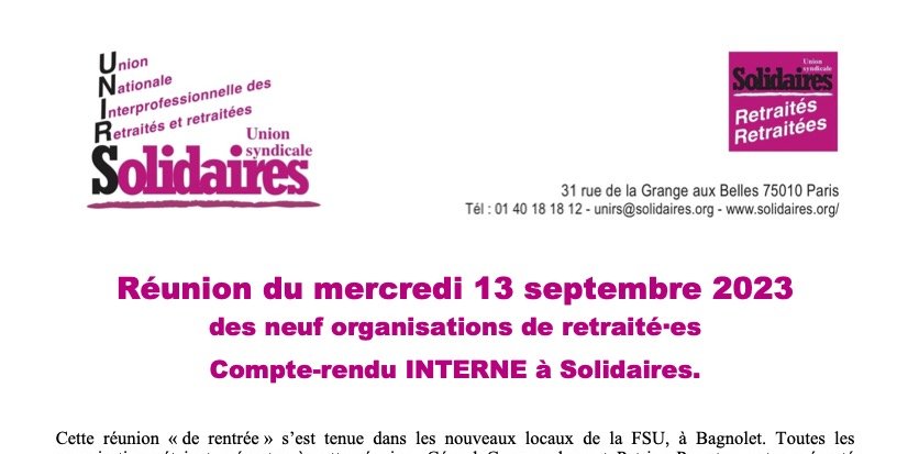 Réunion du mercredi 13 septembre 2023 des neuf organisations de retraité·es Compte-rendu INTERNE à Solidaires.