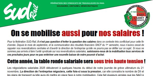 En l’absence d’échelle mobile des salaires (indexation sur les hausses de prix constatées dans l'économie), les bas salaires sont les premières victimes des trop faibles augmentations consenties par le patronat ces dernières années. Pour la fédération SUD-Rail, et nous sommes la seule à porter cette revendication, ce sont des augmentations en somme uniforme que la direction de l’entreprise doit lâcher le 20 novembre !