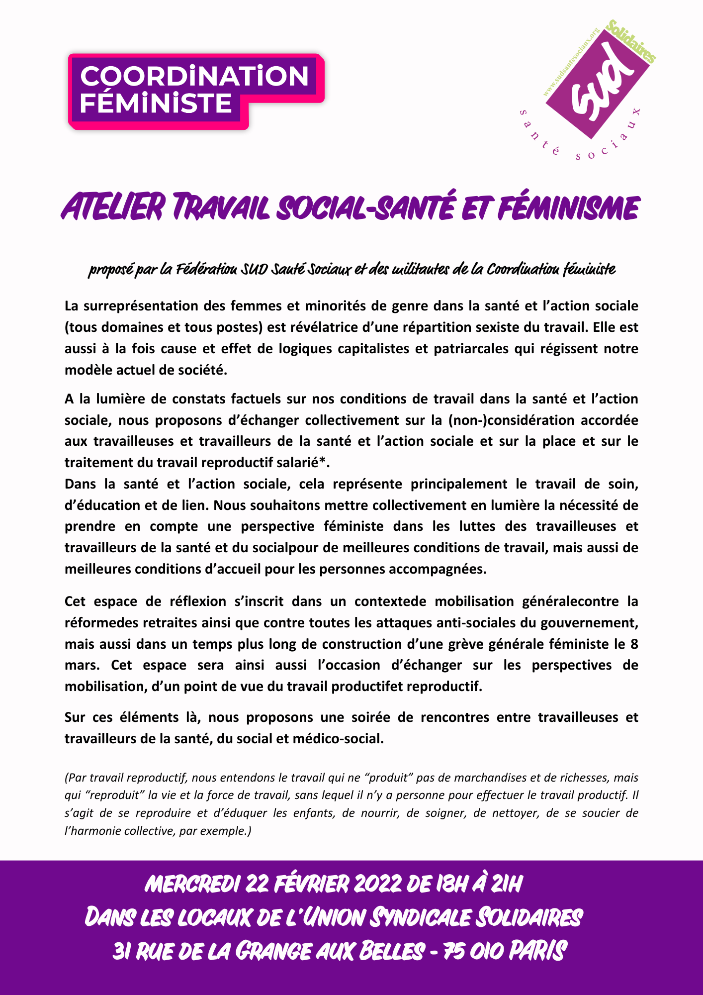 Dans le cadre de la préparation du 8 mars, journée internationale de lutte pour les droits des femmes, la Fédération SUD Santé Sociaux et des militantes de la Coordination féministe propose une soirée d'échanges sur Travail social-santé et féminisme.