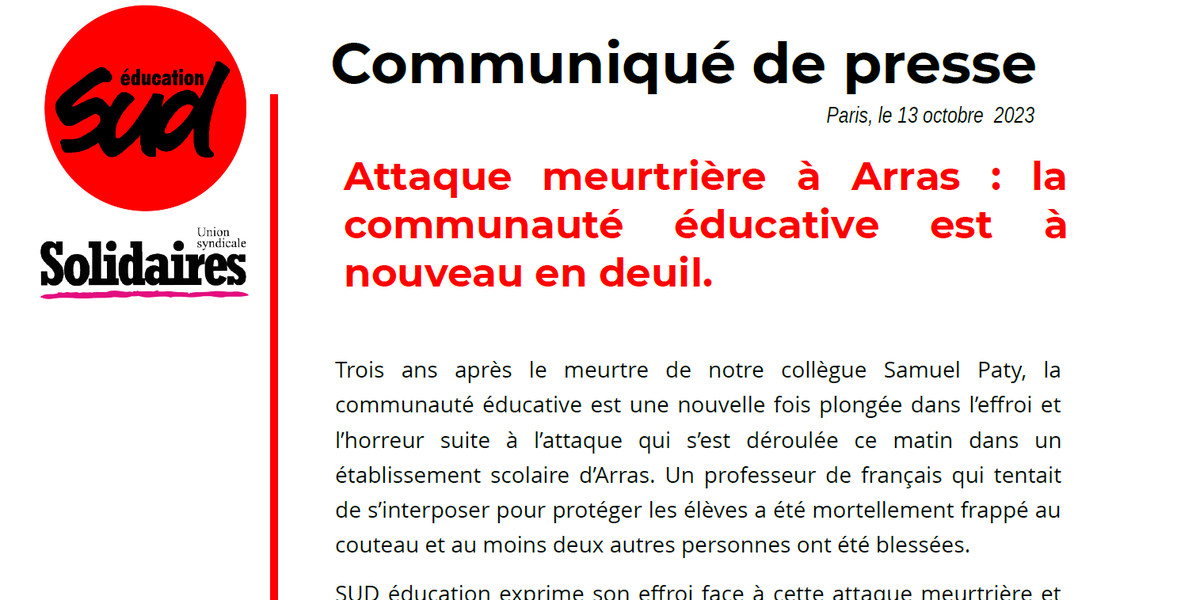 SUD éducation exprime son effroi face à cette attaque meurtrière et adresse ses sincères condoléances aux proches, aux collègues, aux élèves, à la famille de notre collègue. L’heure est au deuil, au recueillement et à la solidarité.