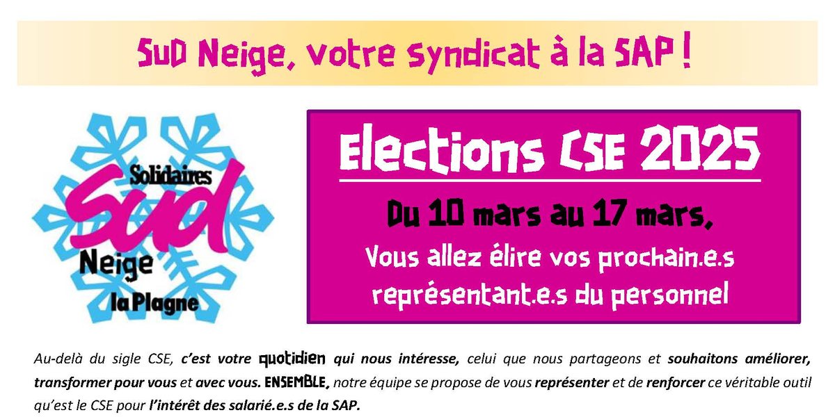 Du 10 au 17 mars 2025, les salarié·es de la Société d'Aménagement de la Plagne vont élire leurs représentant·es du personnel.