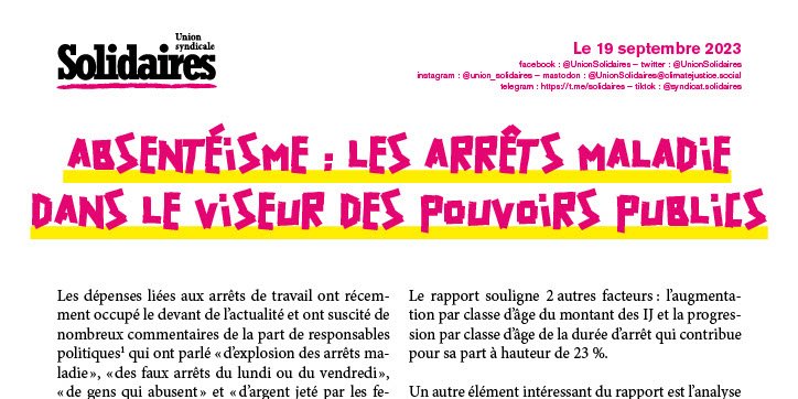 L’offensive actuelle des pouvoirs publics sur les arrêts de travail ignore le rôle majeur des conditions de travail notamment dans les arrêts de moyenne durée qui peuvent être dus aux douleurs articulaires, aux séquelles d’accidents ou à des troubles d’origine psychique à l’intensification du travail. L’assurance maladie comme le gouvernement font également l’impasse sur les arrêts longs liés à des maladies graves, à l’usure professionnelle, au vieillissement des salarié·es et au recul du départ de l’âge de départ en retraite.