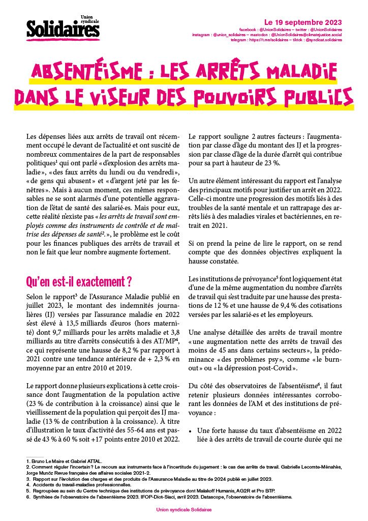 Les mesures décidées sont des mesures purement comptables, uniquement destinées à faire des économies budgétaires et ainsi contribuer à la réduction du déficit de l’assurance maladie. Elles ne tiennent absolument pas compte des causes de la progression du nombre des arrêts de travail liés ou non à un accident ou une maladie d’origine professionnelle et de la hausse des arrêts de longue durée. De même, les conditions de travail physiques et psychologiques, l’organisation du travail ne sont pas interrogées alors qu’elles peuvent être un facteur d’absentéisme. L’opposition à l’allongement de la durée du travail pour bénéficier de sa retraite a démontré que, pour nombre de salarié·es, l’organisation du travail était de moins en moins soutenable.