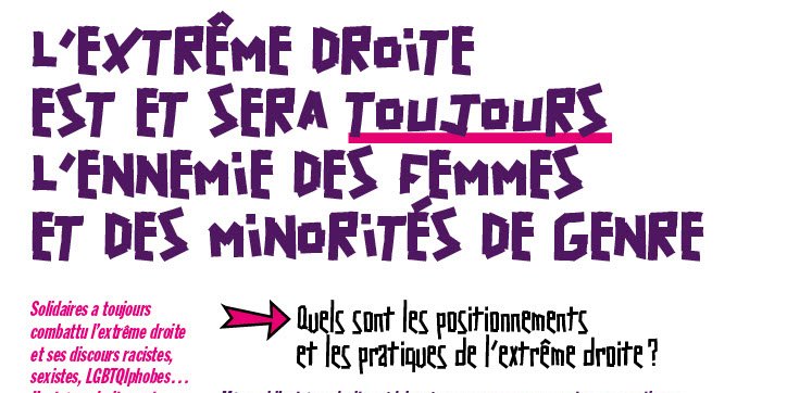 Solidaires a toujours combattu l’extrême droite et ses discours racistes, sexistes, LGBTQIphobes… L’extrême droite porte une vision où “La” femme est mythifiée, ou alors ramenée à sa condition de mère, et reste à protéger (en particulier des immigrés) et s’oppose systématiquement à l’émancipation des femmes et minorités de genre.