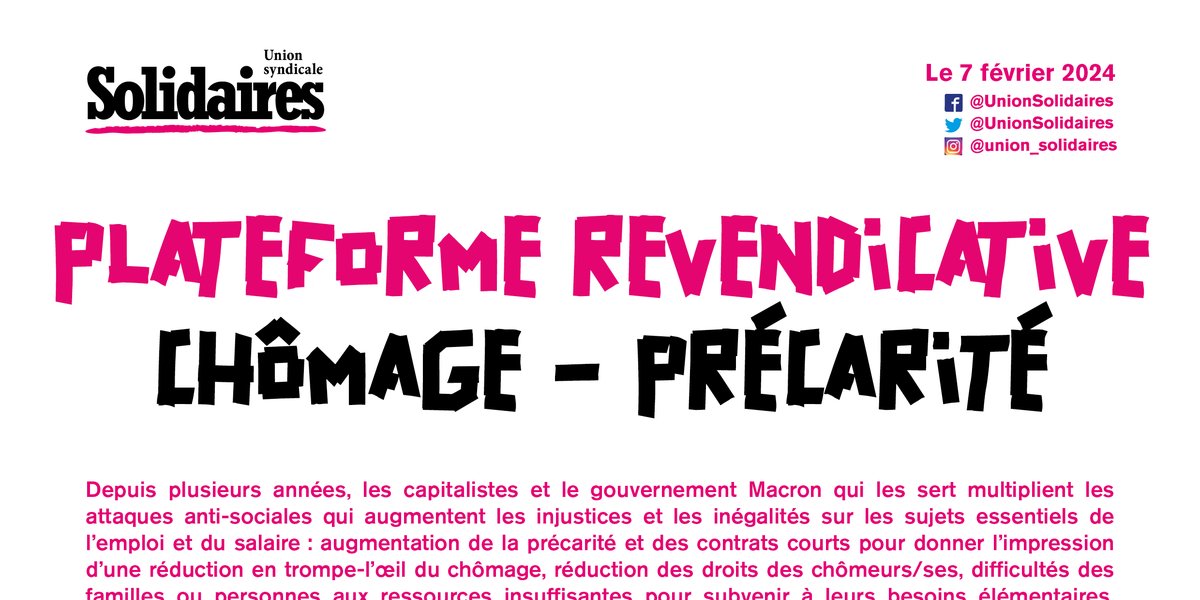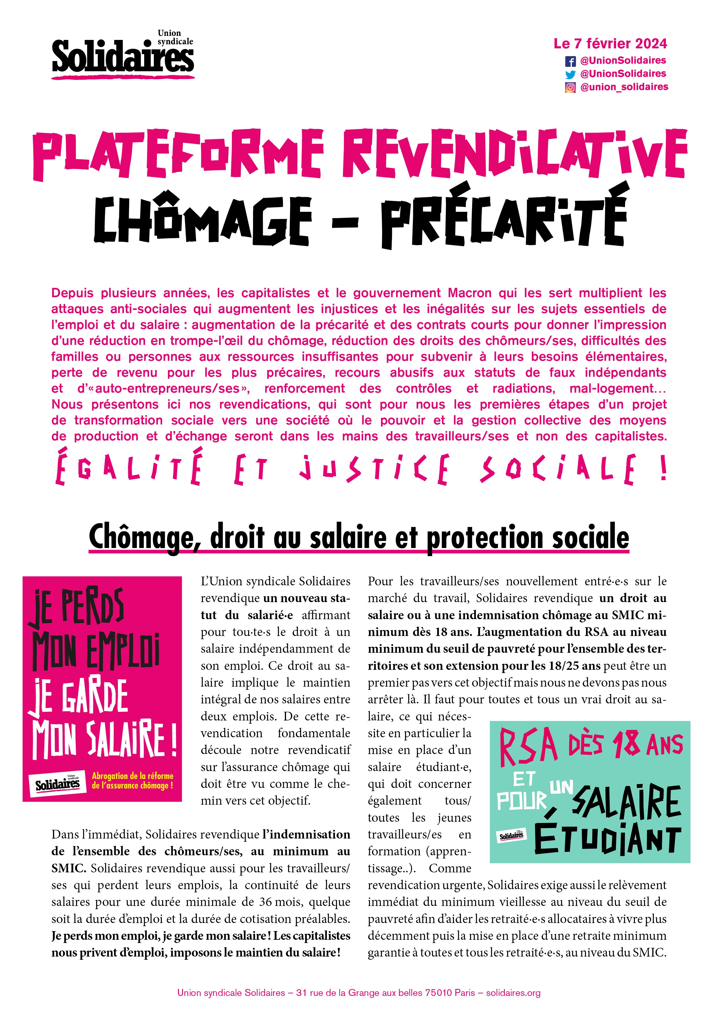 Produite par la commission chômage précarité de Solidaires et validée en comité national d'octobre dernier, la plateforme chômage précarité recense les revendications de l'Union syndicale Solidaires pour lutter contre la précarité sous toutes ses formes et construire une protection sociale des travailleurs et travailleuses contre le risque chômage.