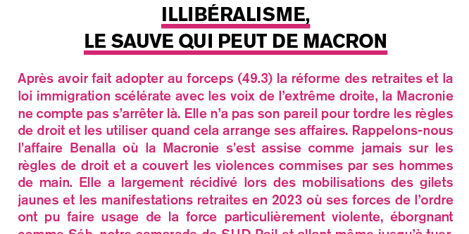 Après avoir fait adopter au forceps (49.3) la réforme des retraites et la loi immigration scélérate avec les voix de l’extrême droite, la Macronie ne compte pas s’arrêter là. Elle n’a pas son pareil pour tordre les règles de droit et les utiliser quand cela arrange ses affaires. Rappelons-nous l’affaire Benalla où la Macronie s’est assise comme jamais sur les règles de droit et a couvert les violences commises par ses hommes de main. Elle a largement récidivé lors des mobilisations des gilets jaunes et les manifestations retraites en 2023 où ses forces de l’ordre ont pu faire usage de la force particulièrement violente, éborgnant comme Séb, notre camarade de SUD Rail et allant même jusqu’à tuer, ainsi du meurtre d’une octogénaire de 84 ans par la BRAV’M en décembre dernier. En réalité, dans une sorte de rapport de force inversé, elle a quitté le domaine de la raison pour n’utiliser que la violence pure et la peur qu’elle suscite pour imposer dans les faits ses idées. Les quartiers populaires, depuis longtemps réprimés, en savent quelque chose et le meurtre de Nahel l’année dernière a été une piqûre de rappel sur la réalité de la pratique du pouvoir par Macron. La police tue d’abord et réprime ensuite avec l’aval de ses responsables politiques, en l’occurence Darmanin et Dupond Moretti.