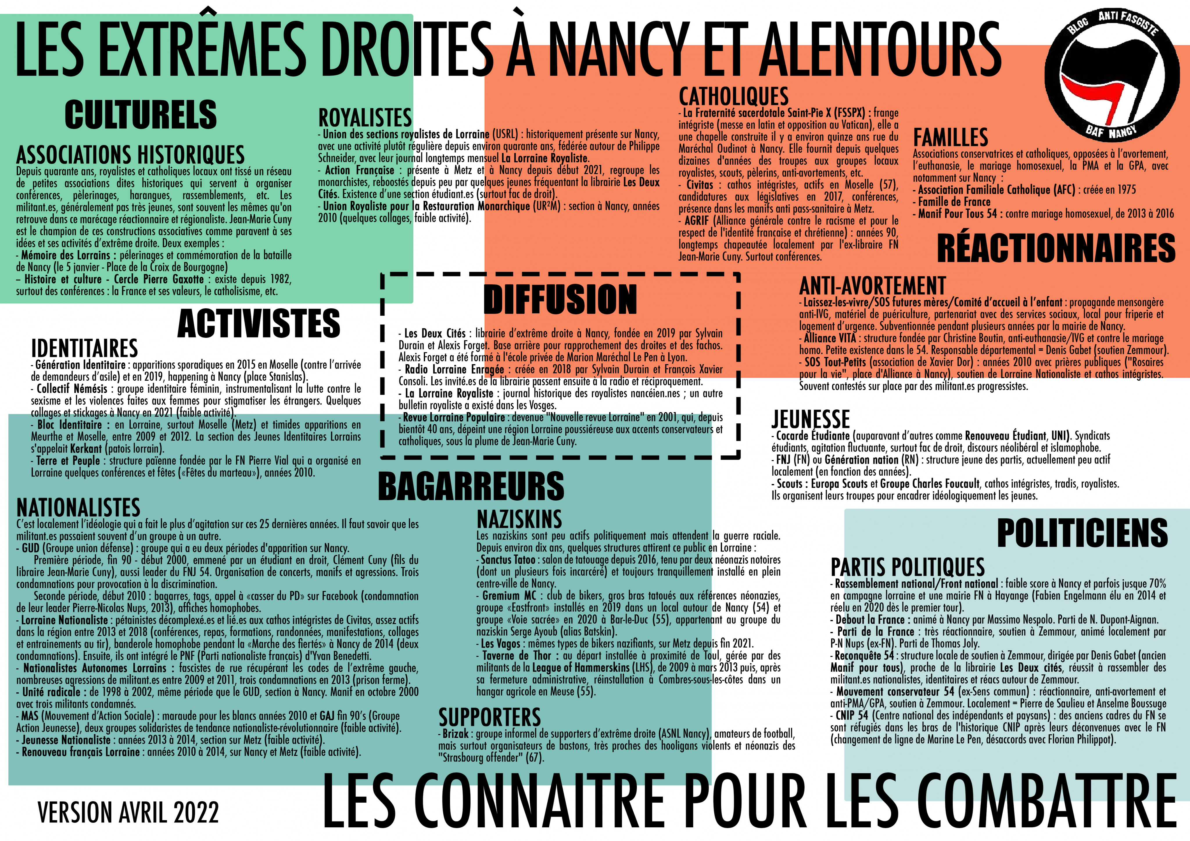 Le BAF scrute aussi, se renseigne puis informe régulièrement sur les activités de l'extrême droite locale. Plusieurs articles ont déjà été publiés, et de tout ce travail quasi quotidien, une cartographie assez complète des fachos locaux a été créée et est régulièrement diffusée. Avec un objectif clair : « Les extrêmes droites à Nancy et alentours, les connaître pour mieux les combattre ».