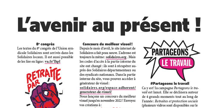 Les textes du 8e congrès de l’Union syndicale Solidaires sont arrivés dans les Solidaires locaux. Il est aussi possible de les lire en ligne: vu.fr/ThpI