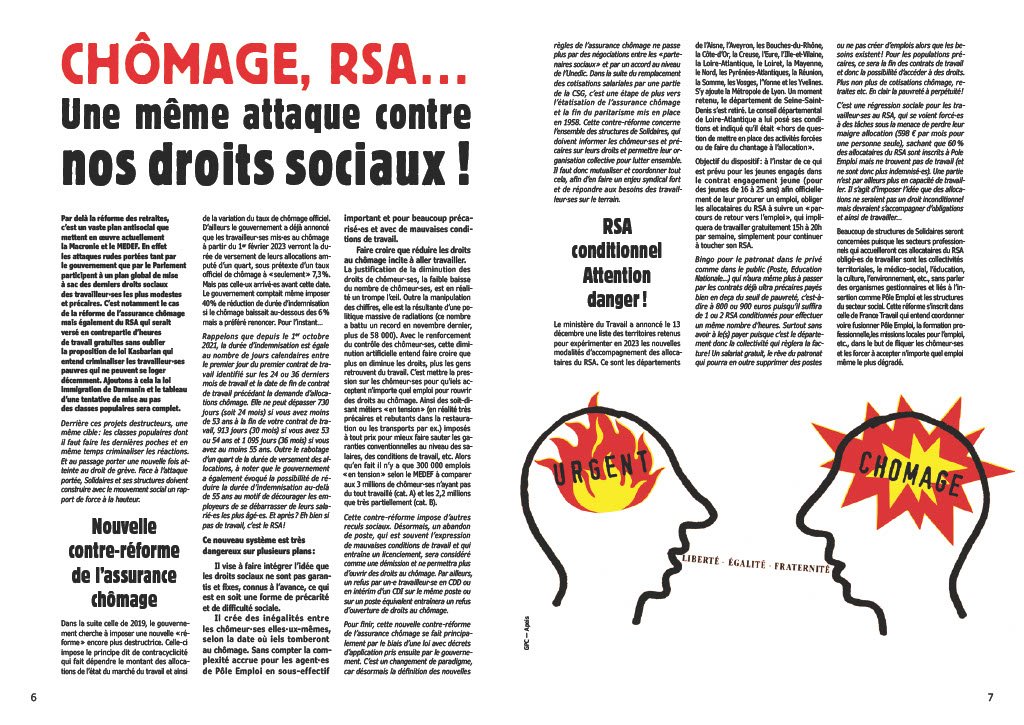 Beaucoup de structures de Solidaires seront concernées puisque les secteurs professionnels qui accueilleront ces allocataires du RSA obligé-e-s de travailler sont les collectivités territoriales, le médico-social, l’éducation, la Culture, l’environnement, etc…, sans parler des organismes gestionnaires et liés à l’insertion comme Pôle Emploi et les structures du secteur social. Cette réforme s’inscrit dans celle de France Travail qui entend coordonner voire fusionner Pôle Emploi, la formation professionnelle, les missions locales pour l’emploi, etc…, dans le but de fliquer les chômeurs-ses et les forcer à accepter n’importe quel emploi même le plus dégradé.