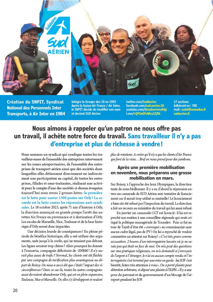 Sur Roissy, à l’approche des Jeux Olympiques, la direction tente de nous bâillonner. Il y a eu d’abord la répression envers un camarade de SUD Aérien avec tentative de licenciement car il aurait trop d’utiliser sa mutuelle ! Le licenciement a bien sûr été refusé par l’inspections du travail. La direction a fait un recours au ministère du travail qui lui aussi refusé. En janvier un camarade CGT est licencié : il lui est reproché son soutien à une conseillère régionale qui avait critiqué la politique managériale de Transdev. Puis ce fut au tour de Tayeb d’être été “convoqué” au commissariat sans aucun cadre légal, pas de PV ! On lui a reproché de vouloir commettre un attentat sur Roissy ! “ C’est très grave comme accusation. 2 heures d’un interrogatoire lunaire où je ne savais pas qui étaient en face de moi. On m’a posé des questions sur mes pratiques religieuses, on m’a demandé si j’envoyais de l’argent à l’étranger. Je n’ai eu aucun compte rendu et l’interrogatoire s’est terminé par une mise en garde : les JOP c’est bientôt, faites très attention à vous. On a porté plainte pour détention arbitraire, et déposé une plainte à l’IGPN. ”