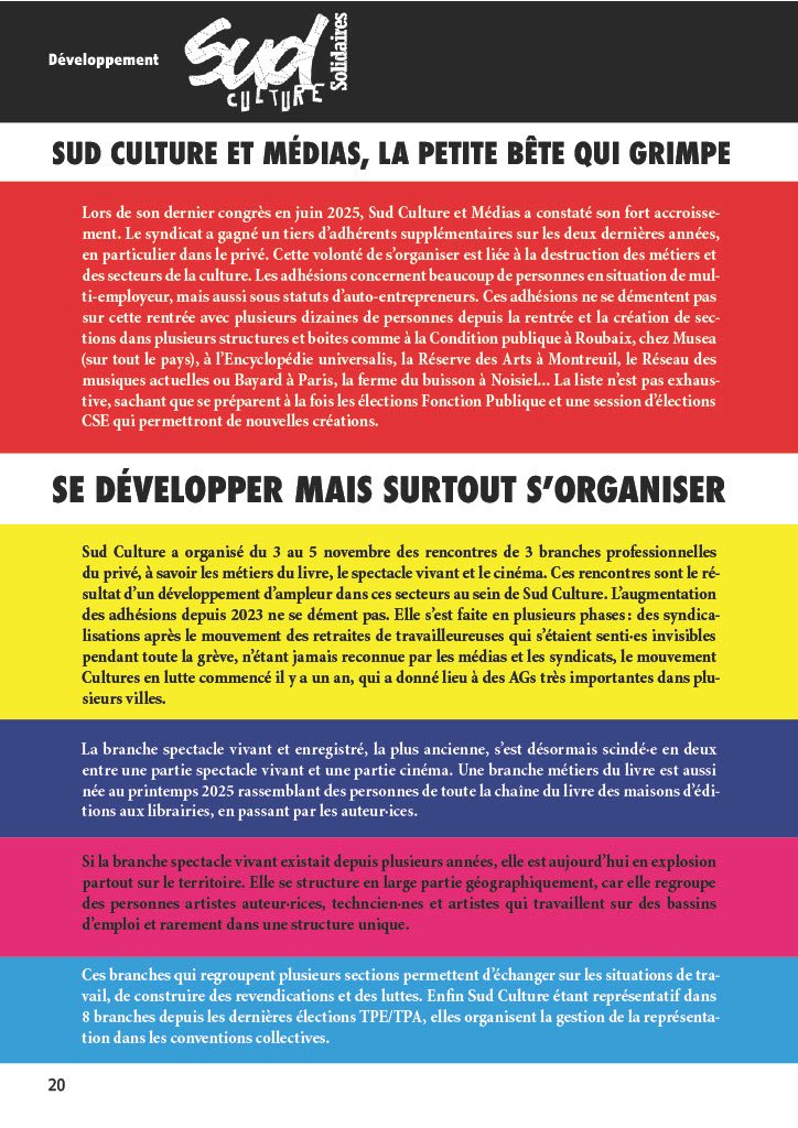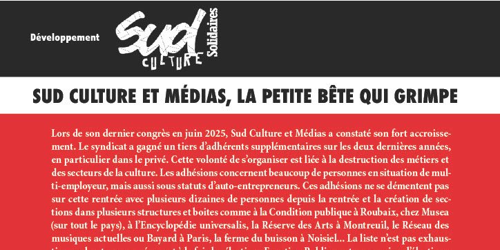 Lors de son dernier congrès en juin 2025, Sud Culture et Médias a constaté son fort accroissement. Le syndicat a gagné un tiers d'adhérents supplémentaires sur les deux dernières années, en particulier dans le privé. Cette volonté de s'organiser est liée à la destruction des métiers et des secteurs de la culture. Les adhésions concernent beaucoup de personnes en situation de multi-employeur, mais aussi sous statuts d'auto-entrepreneurs. Ces adhésions ne se démentent pas sur cette rentrée avec plusieurs dizaines de personnes depuis la rentrée et la création de sections dans plusieurs structures et boites comme à la Condition publique à Roubaix, chez Musea (sur tout le pays), à l'Encyclopédie universalis, la Réserve des Arts à Montreuil, le Réseau des musiques actuelles ou Bayard à Paris, la ferme du buisson à Noisiel... La liste n'est pas exhaustive, sachant que se préparent à la fois les élections Fonction Publique et une session d'élections CSE qui permettront de nouvelles créations.