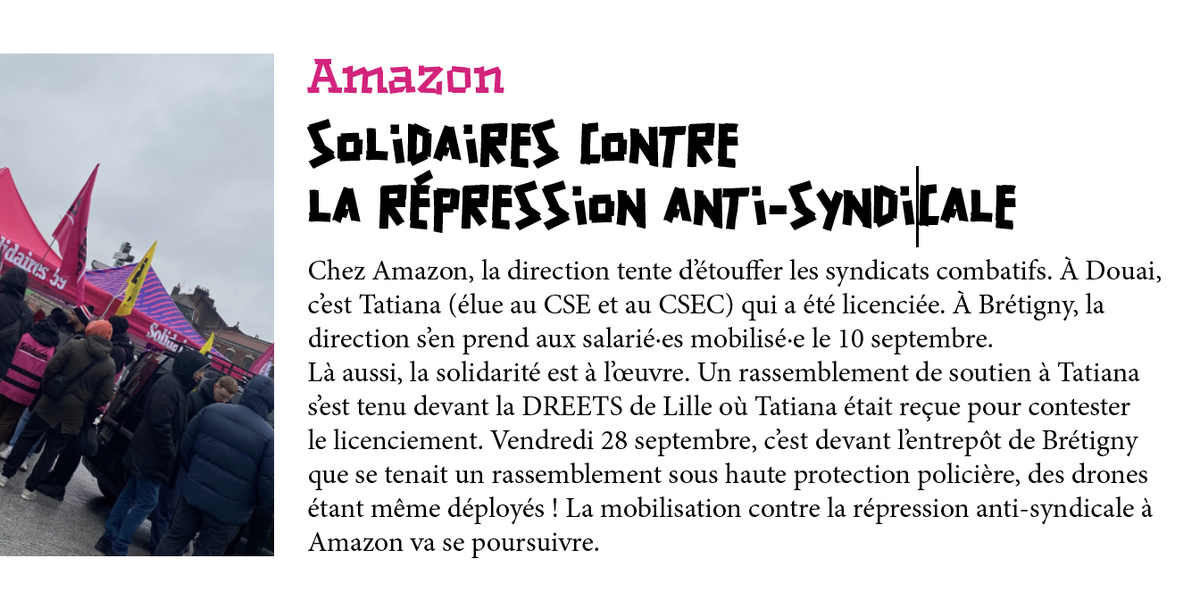 Là aussi, la solidarité est à l’œuvre. Un rassemblement de soutien à Tatiana s’est tenu devant la DREETS de Lille où Tatiana était reçue pour contester le licenciement. Vendredi 28 septembre, c’est devant l’entrepôt de Brétigny que se tenait un rassemblement sous haute protection policière, des drones étant même déployés ! La mobilisation contre la répression anti-syndicale à Amazon va se poursuivre.