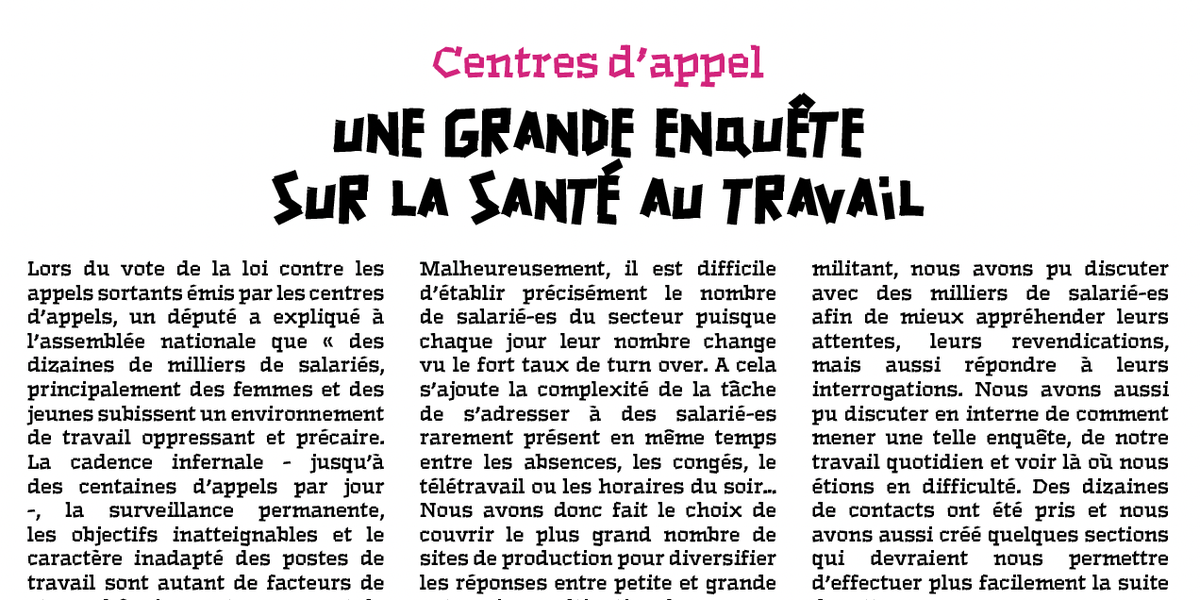 À ce jour dans les centres d’appels, nous approchons les 3000 réponses (entre 5 et 10% des salarié-es du secteur de la sous-traitance) issues de plus 120 sites différents allant de 1500 salarié-es à moins d’une dizaine ! Ce tour de France du secteur, nous a permis de constater les dégâts provoqués par les lois successives sur les appels sortants. D’un point de vue militant, nous avons pu discuter avec des milliers de salarié-es afin de mieux appréhender leurs attentes, leurs revendications, mais aussi répondre à leurs interrogations. Nous avons aussi pu discuter en interne de comment mener une telle enquête, de notre travail quotidien et voir là où nous étions en difficulté. Des dizaines de contacts ont été pris et nous avons aussi créé quelques sections qui devraient nous permettre d’effectuer plus facilement la suite de cette campagne.