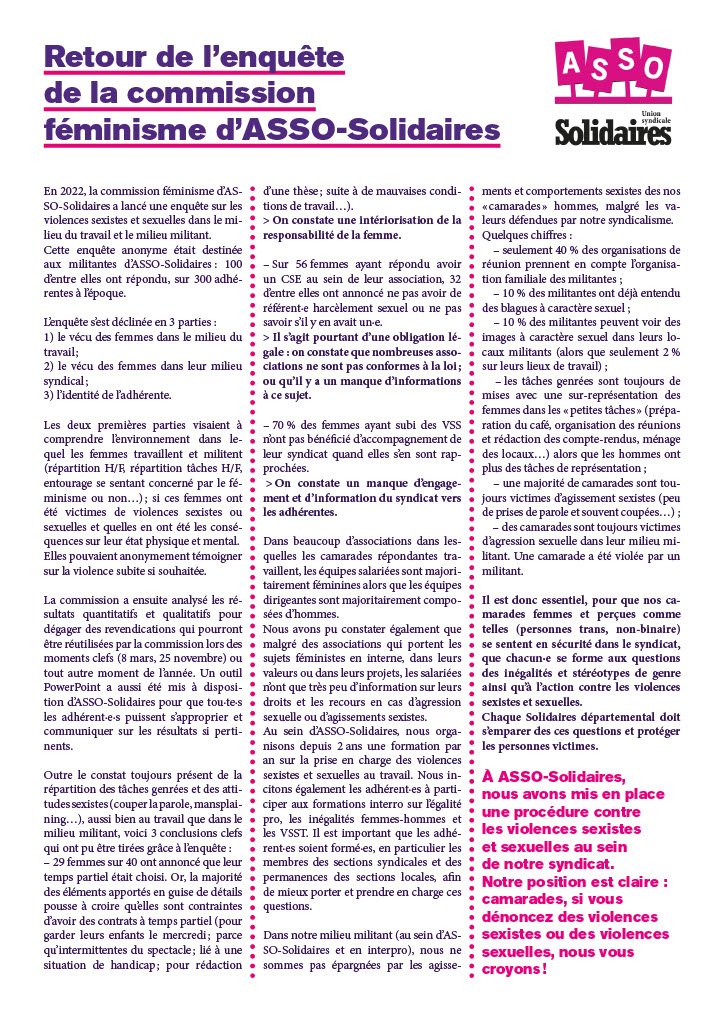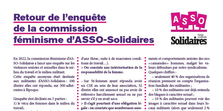 En 2022, la commission féminisme d'ASSO-Solidaires a lancé une enquête sur les violences sexistes et sexuelles dans le milieu du travail et le milieu militant.